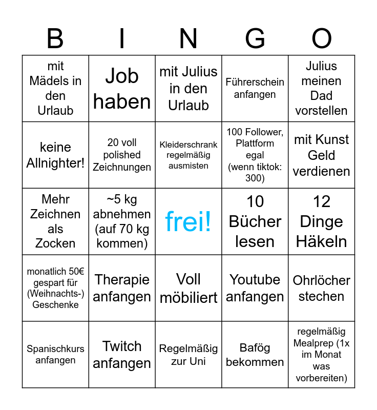 This bingo card has a free space and 24 words: Therapie anfangen, Twitch anfangen, Kleiderschrank regelmäßig ausmisten, Spanischkurs anfangen, Julius meinen Dad vorstellen, mit Mädels in den Urlaub, keine Allnighter!, Job haben, 10 Bücher lesen, Voll möbiliert, 100 Follower, Plattform egal (wenn tiktok: 300), Mehr Zeichnen als Zocken, Youtube anfangen, Ohrlöcher stechen, 20 voll polished Zeichnungen, Bafög bekommen, 12 Dinge Häkeln, mit Julius in den Urlaub, mit Kunst Geld verdienen, ~5 kg abnehmen (auf 70 kg kommen), regelmäßig Mealprep (1x im Monat was vorbereiten), monatlich 50€ gespart für (Weihnachts-) Geschenke, Führerschein anfangen and Regelmäßig zur Uni.