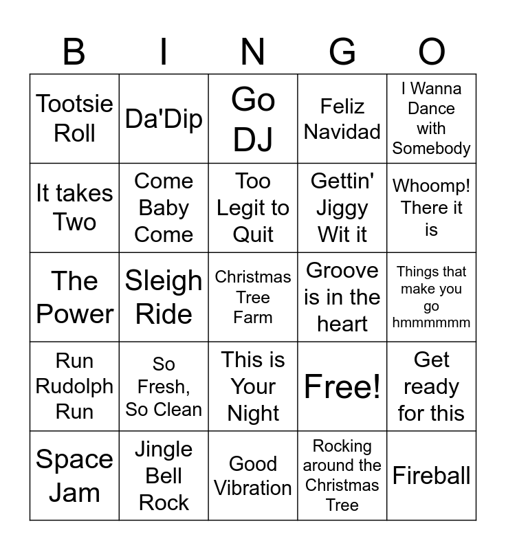 This bingo card has 25 words: So Fresh, So Clean, Good Vibration, Too Legit to Quit, Space Jam, I Wanna Dance with Somebody, Tootsie Roll, It takes Two, Da'Dip, Groove is in the heart, This is Your Night, Gettin' Jiggy Wit it, The Power, Free!, Get ready for this, Come Baby Come, Fireball, Things that make you go hmmmmmm, Go DJ, Whoomp! There it is, Sleigh Ride, Christmas Tree Farm, Jingle Bell Rock, Run Rudolph Run, Feliz Navidad and Rocking around the Christmas Tree.