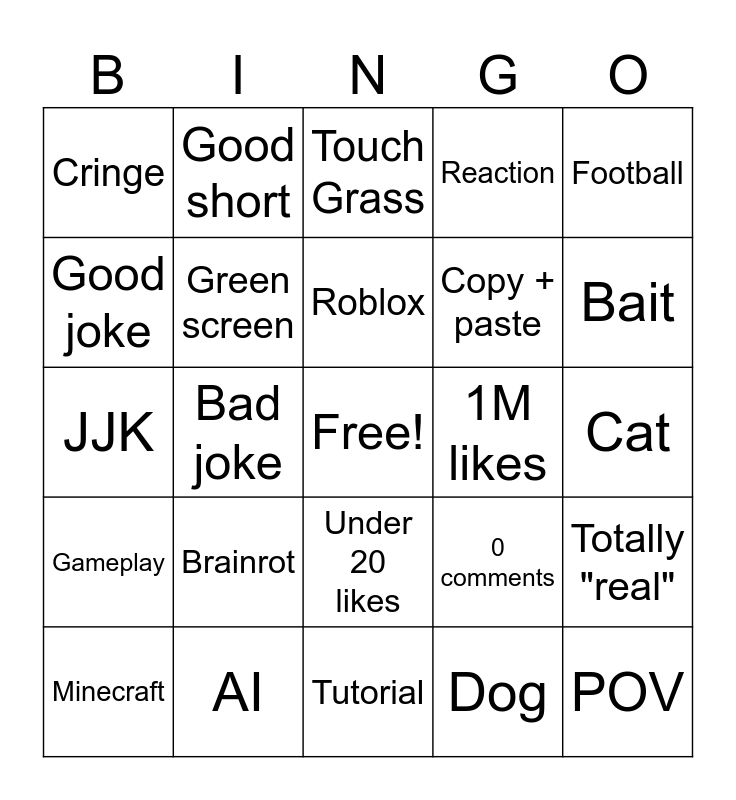 This bingo card has a free space and 24 words: Brainrot, AI, Roblox, Minecraft, Football, Cringe, Good joke, Good short, 1M likes, Under 20 likes, Copy + paste, JJK, 0 comments, Totally "real", Green screen, Dog, Cat, Touch Grass, Bait, Bad joke, POV, Gameplay, Reaction and Tutorial.