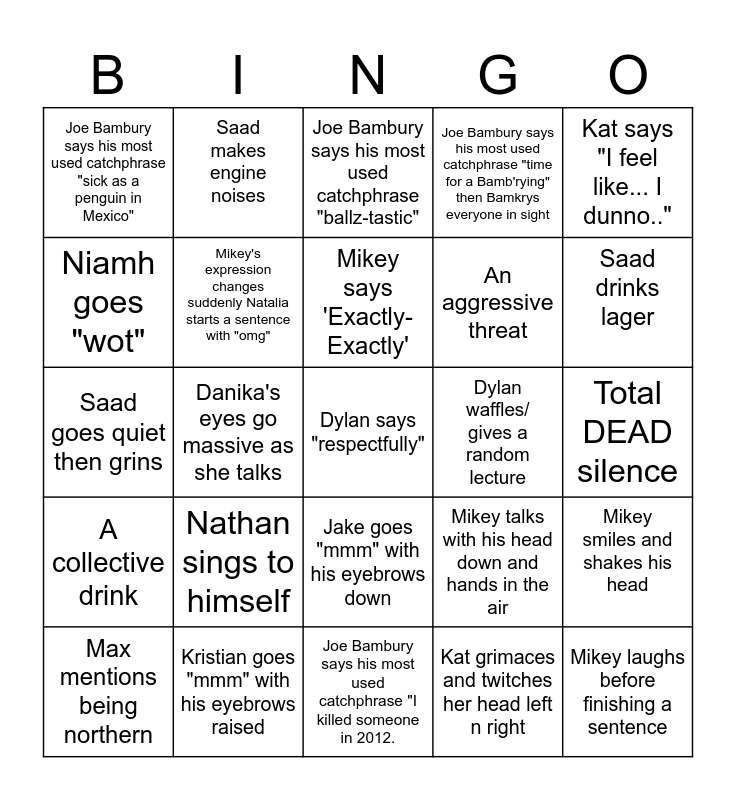 This bingo card has a free space and 24 words: Nathan sings to himself, Kristian goes "mmm" with his eyebrows raised, Mikey says 'Exactly-Exactly', Max mentions being northern, Kat says "I feel like... I dunno..", Joe Bambury says his most used catchphrase "sick as a penguin in Mexico", Niamh goes "wot", Saad makes engine noises, Dylan waffles/ gives a random lecture, Jake goes "mmm" with his eyebrows down, An aggressive threat, Saad goes quiet then grins, Mikey talks with his head down and hands in the air, Mikey smiles and shakes his head, Mikey's expression changes suddenly Natalia starts a sentence with "omg", Kat grimaces and twitches her head left n right, Total DEAD silence, Joe Bambury says his most used catchphrase "ballz-tastic", Saad drinks lager, Danika's eyes go massive as she talks, Mikey laughs before finishing a sentence, A collective drink, Joe Bambury says his most used catchphrase "time for a Bamb'rying" then Bamkrys everyone in sight and Joe Bambury says his most used catchphrase "I killed someone in 2012..