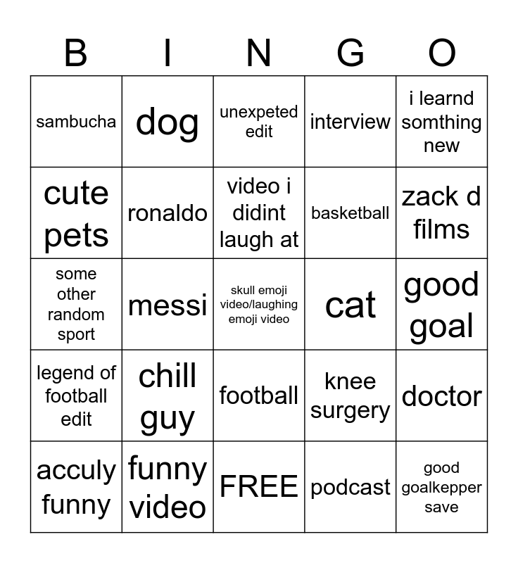This bingo card has a free space and 24 words: chill guy, funny video, video i didint laugh at, acculy funny, i learnd somthing new, sambucha, cute pets, dog, cat, football, basketball, some other random sport, knee surgery, doctor, ronaldo, podcast, good goal, unexpeted edit, zack d films, messi, good goalkepper save, legend of football edit, interview and FREE.
