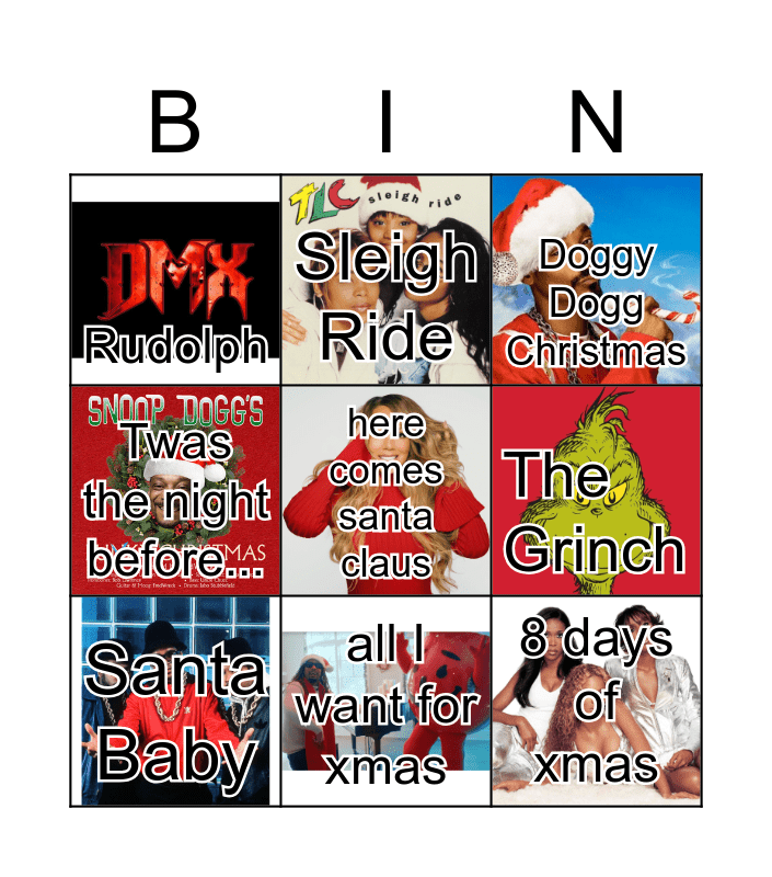 This bingo card has 8 images, a free space and 8 words: The Grinch, Doggy Dogg Christmas, Sleigh Ride, Santa Baby, Rudolph, 8 days of xmas, Twas the night before... and all I want for xmas.