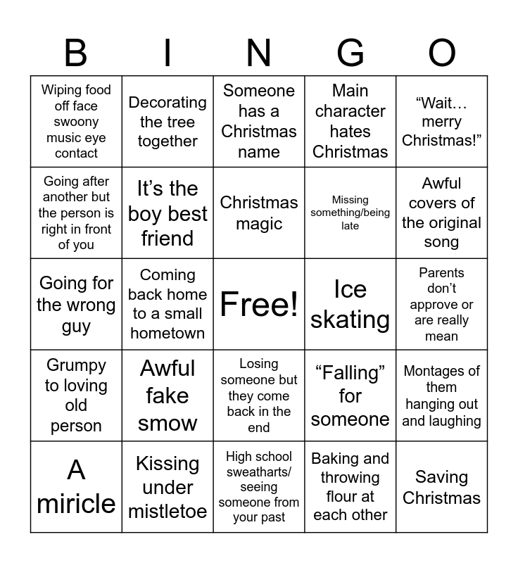 This bingo card has a free space and 24 words: Awful fake smow, Kissing under mistletoe, Christmas magic, A miricle, “Wait… merry Christmas!”, Wiping food off face swoony music eye contact, Going after another but the person is right in front of you, Decorating the tree together, Ice skating, Losing someone but they come back in the end, Missing something/being late, Going for the wrong guy, “Falling” for someone, Montages of them hanging out and laughing, It’s the boy best friend, Baking and throwing flour at each other, Parents don’t approve or are really mean, Someone has a Christmas name, Awful covers of the original song, Coming back home to a small hometown, Saving Christmas, Grumpy to loving old person, Main character hates Christmas and High school sweatharts/ seeing someone from your past.