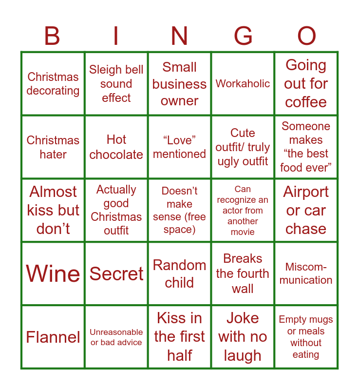 This bingo card has a free space and 34 words: “I know it sounds stupid”, Joke with no laugh, “I’m not gonna fall in love with you”, Teeth too white, Wine, Hot chocolate, Going out for coffee, Flannel, Sleigh bell sound effect, Classic town street, “Love” mentioned, Small business owner, Snow, New or back in town, Can recognize an actor from another movie, Someone makes “the best food ever”, Unreasonable or bad advice, Almost kiss but don’t, Secret, Breaks the fourth wall, Random child, Santa in disguise, Christmas decorating, Airport or car chase, Kiss in the first half, Empty mugs or meals without eating, Workaholic, Family emergency, Cute outfit/ truly ugly outfit, Christmas hater, Tangled Christmas lights, Actually good Christmas outfit, Miscom- munication and Dead spouse.