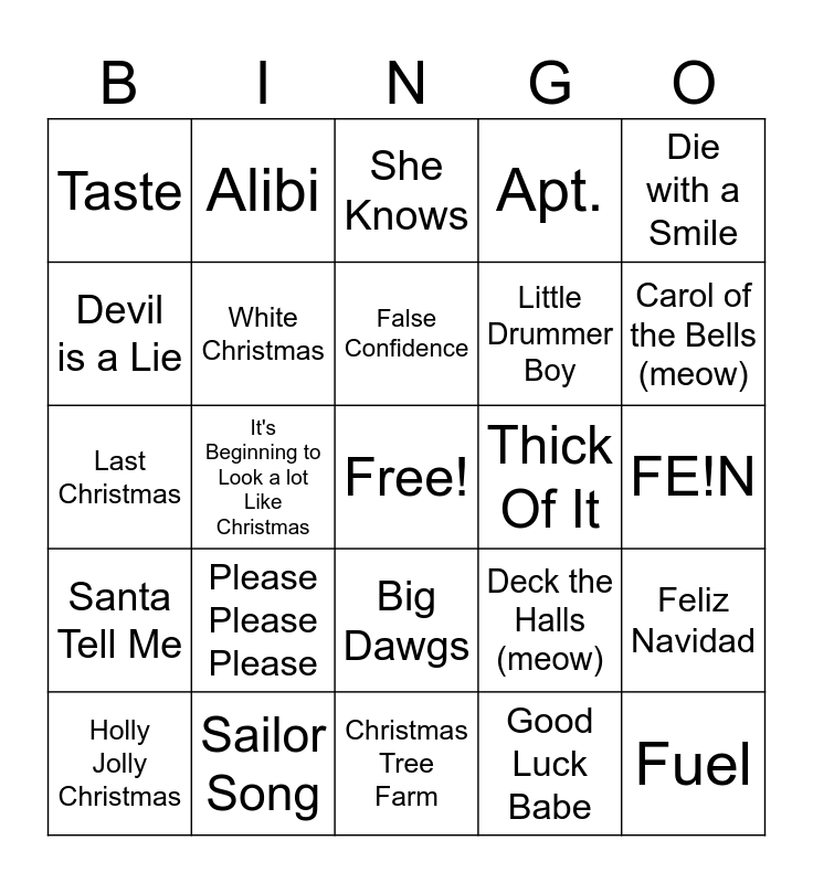 This bingo card has a free space and 40 words: Diva, Last Christmas, Rockin' Around the Christmas Tree, White Christmas, Sailor Song, Big Dawgs, False Confidence, Wildflower, Die with a Smile, Santa Tell Me, It's Beginning to Look a lot Like Christmas, Apt., Fuel, FE!N, Thick Of It, Please Please Please, Espresso, Taste, Bed Chem, She Knows, Feliz Navidad, Good Luck Babe, Little Drummer Boy, Devil is a Lie, Too Sweet, Birds of a Feather, We Can't be Friends, Juno, Hot to Go!, Slow it Down, Lovin on Me, Holly Jolly Christmas, Winter Wonderland, Deck the Halls (meow), Carol of the Bells (meow), Christmas Tree Farm, Jingle Bell Rock, Rudolph the Red Nosed Reindeer, Alibi and Pose for Me.