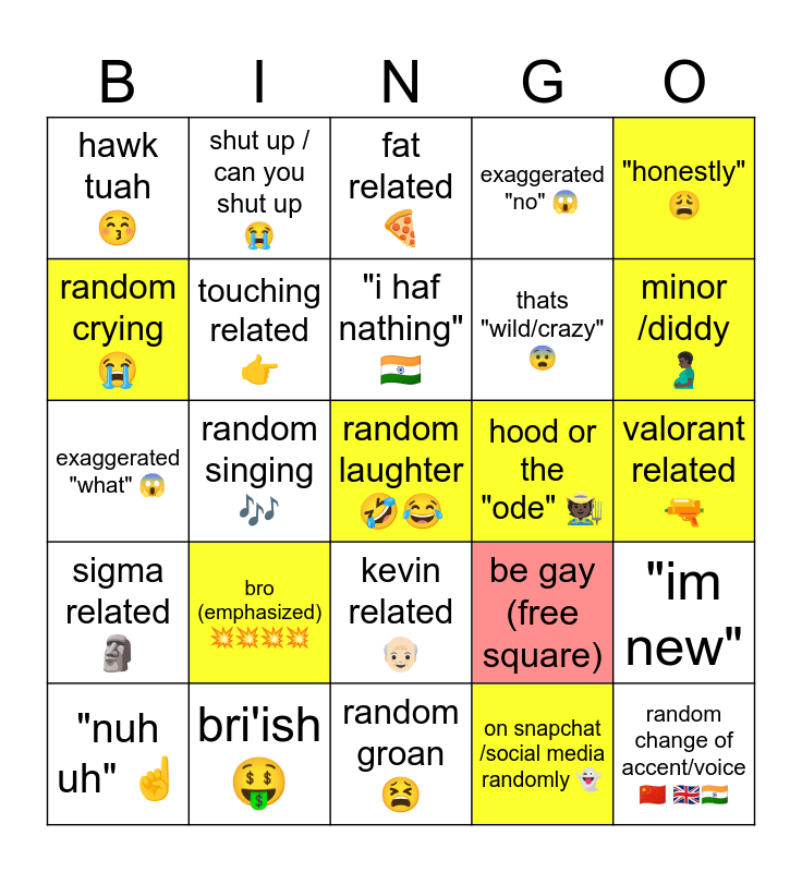This bingo card has 25 words: bro (emphasized)๐ฅ๐ฅ๐ฅ๐ฅ, random groan ๐ซ, "i haf nathing" ๐ฎ๐ณ, "nuh uh" โ๏ธ, "honestly" ๐ฉ, hawk tuah ๐, random crying ๐ญ, shut up / can you shut up ๐ญ, hood or the "ode" ๐ง๐ฟโ๐พ, kevin related ๐ด๐ป, thats "wild/crazy" ๐จ, exaggerated "what" ๐ฑ, be gay (free square), "im new", touching related ๐, random change of accent/voice ๐จ๐ณ ๐ฌ๐ง๐ฎ๐ณ, valorant related ๐ซ, fat related ๐, minor /diddy๐ซ๐ฟ, random singing ๐ถ, random laughter ๐คฃ๐, bri'ish๐ค, sigma related ๐ฟ, exaggerated "no" ๐ฑ and on snapchat /social media randomly ๐ป.