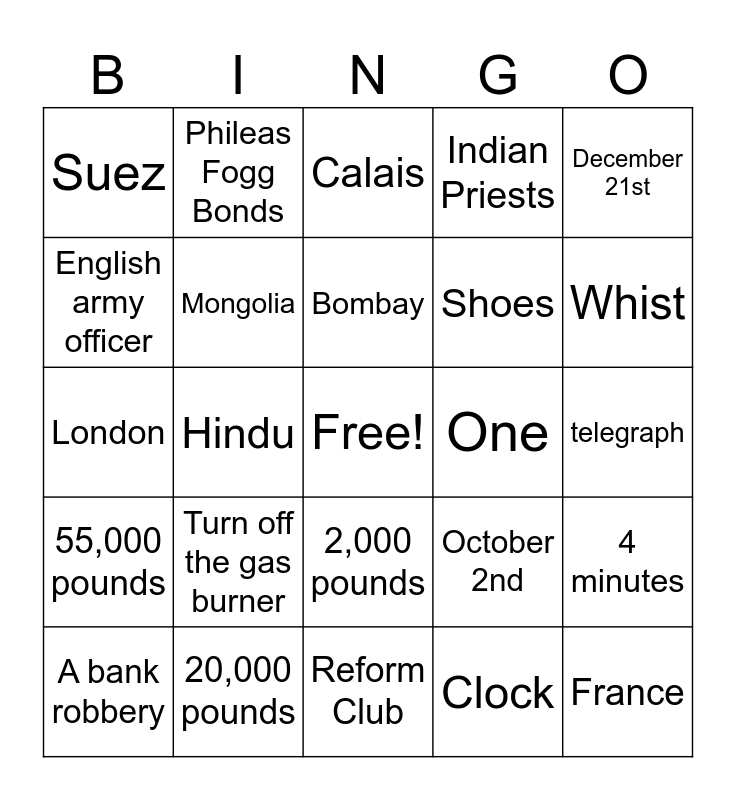 This bingo card has a free space and 24 words: Turn off the gas burner, 20,000 pounds, Bombay, A bank robbery, December 21st, Suez, English army officer, Phileas Fogg Bonds, One, 2,000 pounds, Shoes, London, October 2nd, 4 minutes, Mongolia, Clock, telegraph, Calais, Whist, Hindu, France, 55,000 pounds, Indian Priests and Reform Club.