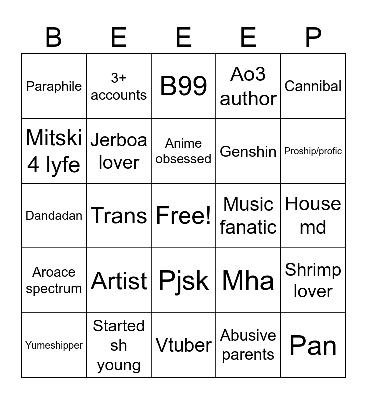 This bingo card has a free space and 24 words: Artist, Started sh young, Anime obsessed, Yumeshipper, Cannibal, Paraphile, Mitski 4 lyfe, 3+ accounts, Music fanatic, Pjsk, Genshin, Dandadan, Mha, Shrimp lover, Jerboa lover, Abusive parents, House md, B99, Proship/profic, Trans, Pan, Aroace spectrum, Ao3 author and Vtuber.