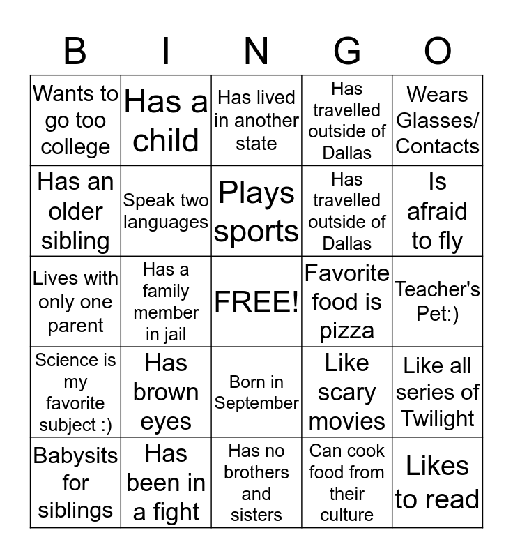 This bingo card has a free space and 24 words: Has brown eyes, Has been in a fight, Plays sports, Babysits for siblings, Wears Glasses/ Contacts, Wants to go too college, Has an older sibling, Has a child, Favorite food is pizza, Born in September, Has travelled outside of Dallas, Lives with only one parent, Like scary movies, Like all series of Twilight, Speak two languages, Can cook food from their culture, Teacher's Pet:), Has lived in another state, Is afraid to fly, Has a family member in jail, Likes to read, Science is my favorite subject :), Has travelled outside of Dallas and Has no brothers and sisters.
