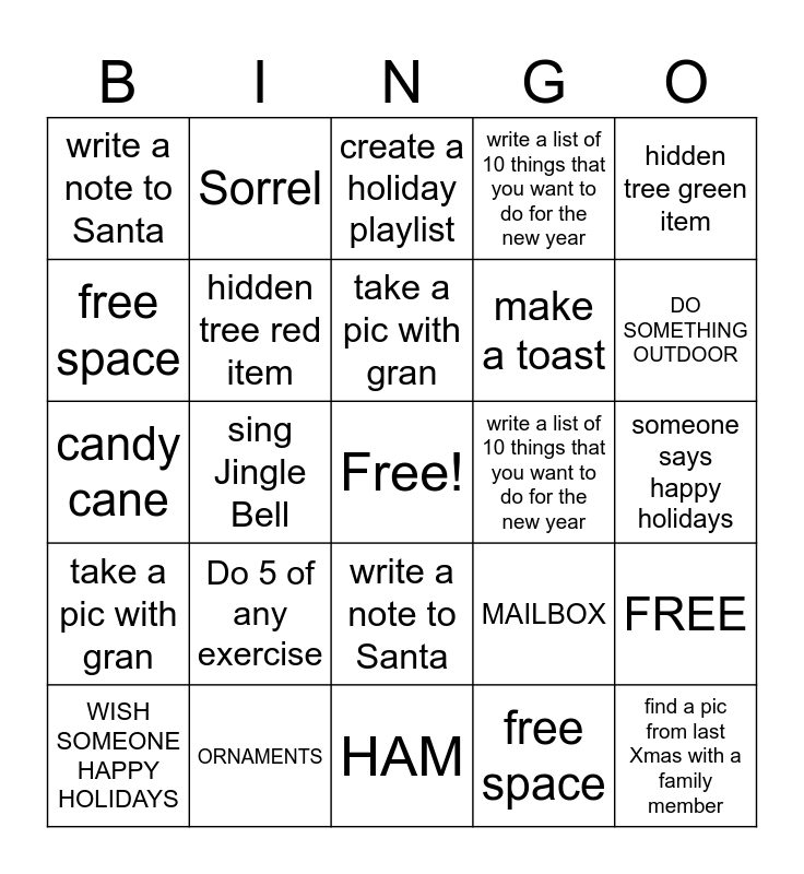 This bingo card has a free space and 35 words: candy cane, hidden tree green item, eat a piece of candy, hidden tree red item, write a note to Santa, write a list of 10 things that you want to do for the new year, free space, sing Jingle Bell, take a pic with gran, find a pic from last Xmas with a family member, candy cane, hidden tree green item, eat a piece of candy, hidden tree red item, write a note to Santa, write a list of 10 things that you want to do for the new year, free space, sing Jingle Bell, take a pic with gran, find a pic from last Xmas with a family member, MAILBOX, WISH SOMEONE HAPPY HOLIDAYS, FREE, ORNAMENTS, create a holiday playlist, DO SOMETHING OUTDOOR, take a family pic, ELF, make a toast, someone says happy holidays, Someone says "happy holidays", HAM, Do 5 of any exercise, Sorrel and Eggnog.