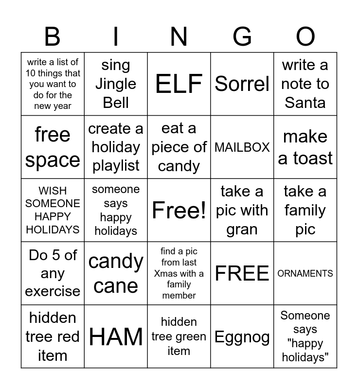 This bingo card has a free space and 25 words: candy cane, hidden tree green item, eat a piece of candy, hidden tree red item, write a note to Santa, write a list of 10 things that you want to do for the new year, free space, sing Jingle Bell, take a pic with gran, find a pic from last Xmas with a family member, MAILBOX, WISH SOMEONE HAPPY HOLIDAYS, FREE, ORNAMENTS, create a holiday playlist, DO SOMETHING OUTDOOR, take a family pic, ELF, make a toast, someone says happy holidays, Someone says "happy holidays", HAM, Do 5 of any exercise, Sorrel and Eggnog.