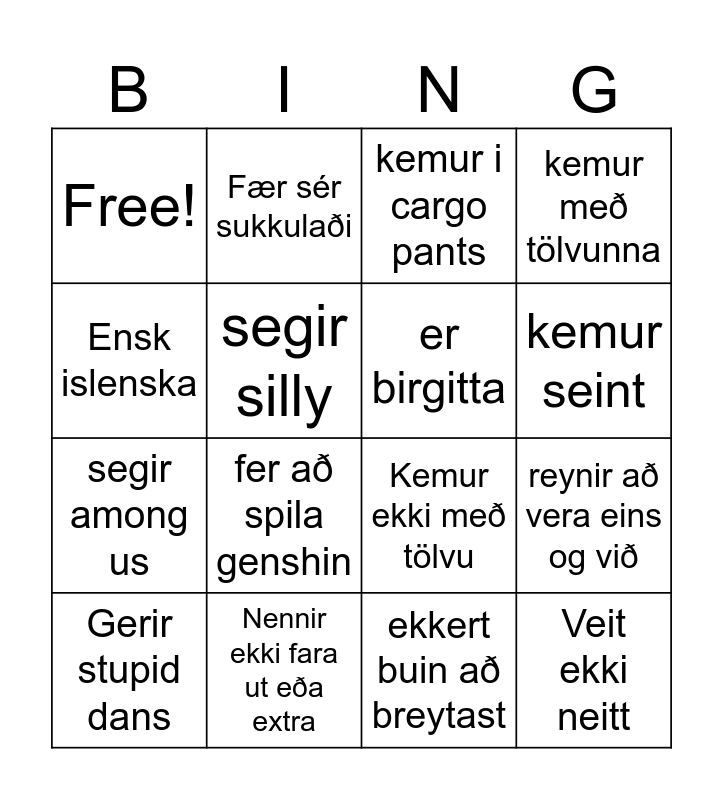 This bingo card has 16 words: Gerir stupid dans, Nennir ekki fara ut eða extra, kemur i cargo pants, kemur með tölvunna, Ensk islenska, Fær sér sukkulaði, Kemur ekki með tölvu, reynir að vera eins og við, Free!, segir silly, ekkert buin að breytast, kemur seint, segir among us, fer að spila genshin, er birgitta and Veit ekki neitt.