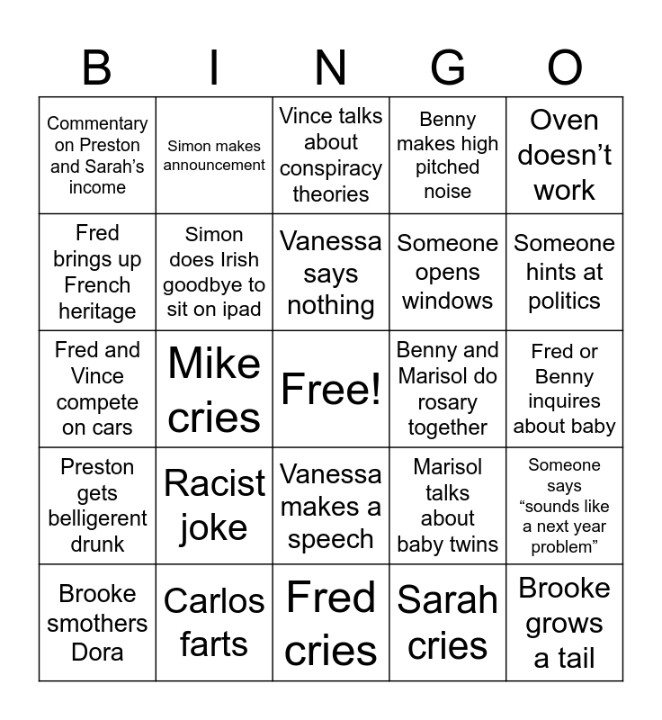 This bingo card has a free space and 24 words: Racist joke, Carlos farts, Vanessa says nothing, Brooke smothers Dora, Oven doesn’t work, Commentary on Preston and Sarah’s income, Fred brings up French heritage, Simon makes announcement, Benny and Marisol do rosary together, Vanessa makes a speech, Someone opens windows, Fred and Vince compete on cars, Marisol talks about baby twins, Someone says “sounds like a next year problem”, Simon does Irish goodbye to sit on ipad, Sarah cries, Fred or Benny inquires about baby, Vince talks about conspiracy theories, Someone hints at politics, Mike cries, Brooke grows a tail, Preston gets belligerent drunk, Benny makes high pitched noise and Fred cries.