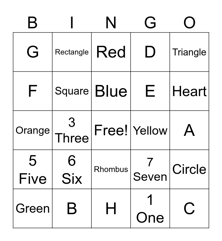 This bingo card has a free space and 32 words: 1 One, 2 Two, 3 Three, 4 Four, 5 Five, Square, Triangle, Circle, Rectangle, Oval, Blue, Red, Pink, Purple, Yellow, Brown, Green, Orange, Rhombus, 6 Six, 7 Seven, 8 Eight, A, B, C, D, E, F, G, H, Star and Heart.