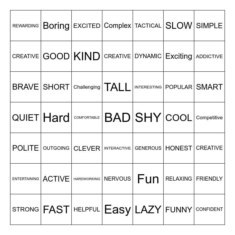 This bingo card has a free space and 48 words: Fun, Exciting, Easy, Hard, Challenging, Competitive, Boring, FAST, SLOW, INTERACTIVE, SIMPLE, Complex, POPULAR, INTERESTING, ENTERTAINING, COOL, CREATIVE, ADDICTIVE, RELAXING, TACTICAL, DYNAMIC, COMFORTABLE, REWARDING, GOOD, FRIENDLY, KIND, SMART, STRONG, TALL, SHORT, FUNNY, SHY, CREATIVE, ACTIVE, QUIET, GENEROUS, HONEST, BRAVE, CLEVER, HARDWORKING, POLITE, CONFIDENT, EXCITED, HELPFUL, CREATIVE, NERVOUS, OUTGOING and LAZY.