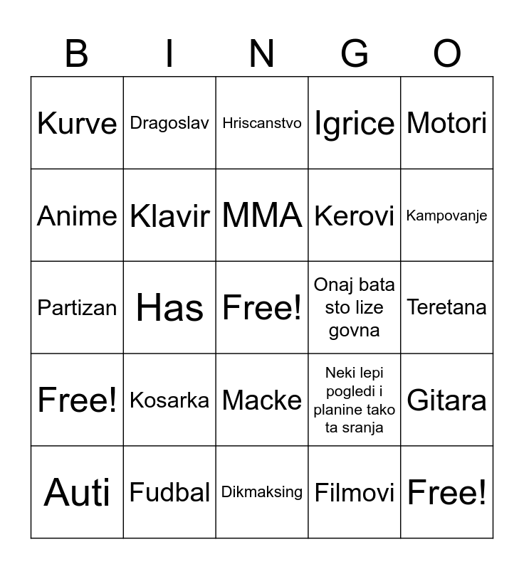 This bingo card has a free space and 24 words: Kosarka, Fudbal, MMA, Auti, Motori, Kurve, Anime, Dragoslav, Onaj bata sto lize govna, Macke, Kerovi, Partizan, Neki lepi pogledi i planine tako ta sranja, Gitara, Klavir, Filmovi, Teretana, Hriscanstvo, Kampovanje, Has, Free!, Free!, Igrice and Dikmaksing.