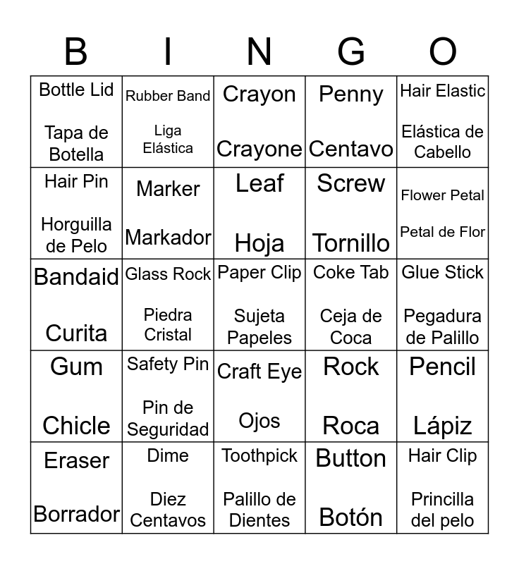 This bingo card has a free space and 24 words: Safety Pin Pin de Seguridad, Dime Diez Centavos, Leaf Hoja, Eraser Borrador, Hair Elastic Elástica de Cabello, Bottle Lid Tapa de Botella, Hair Pin Horguilla de Pelo, Rubber Band Liga Elástica, Coke Tab Ceja de Coca, Craft Eye Ojos, Screw Tornillo, Bandaid Curita, Rock Roca, Pencil Lápiz, Marker Markador, Button Botón, Glue Stick Pegadura de Palillo, Crayon Crayone, Flower Petal Petal de Flor, Glass Rock Piedra Cristal, Hair Clip Princilla del pelo, Gum Chicle, Penny Centavo and Toothpick Palillo de Dientes.
