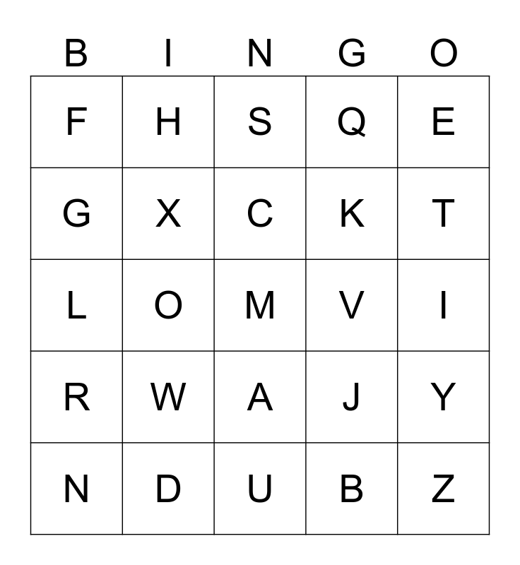 This bingo card has 26 words: A, B, C, D, E, F, G, H, I, J, K, L, Y, N, O, P, Q, R, S, M, T, U, V, W, X and Z.