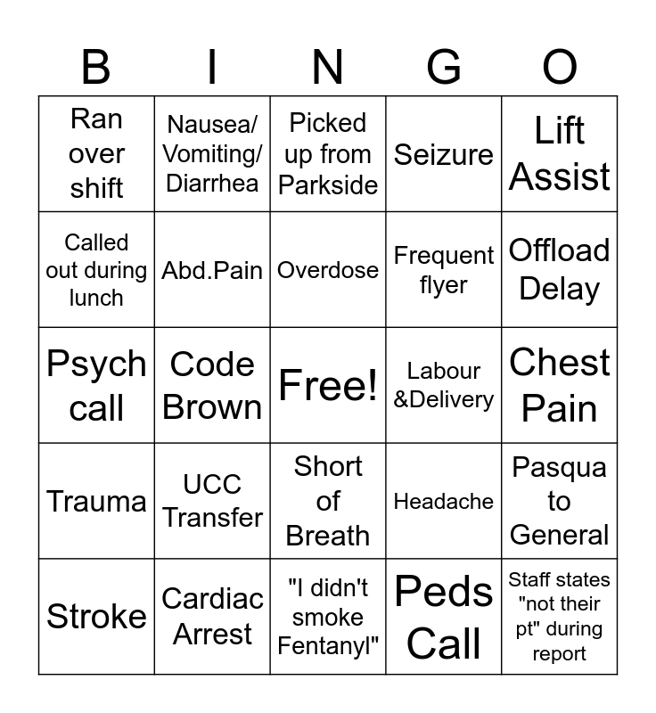 This bingo card has a free space and 24 words: UCC Transfer, Cardiac Arrest, Overdose, Stroke, Lift Assist, Ran over shift, Called out during lunch, Nausea/ Vomiting/ Diarrhea, Labour &Delivery, Short of Breath, Frequent flyer, Psych call, Headache, Pasqua to General, Abd.Pain, Peds Call, Chest Pain, Picked up from Parkside, Offload Delay, Code Brown, Staff states "not their pt" during report, Trauma, Seizure and "I didn't smoke Fentanyl".