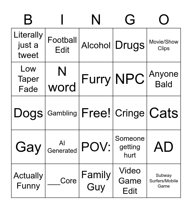 This bingo card has a free space and 24 words: AI Generated, ___Core, Furry, Actually Funny, Movie/Show Clips, Literally just a tweet, Low Taper Fade, Football Edit, Cringe, POV:, NPC, Dogs, Someone getting hurt, AD, N word, Video Game Edit, Cats, Alcohol, Anyone Bald, Gambling, Subway Surfers/Mobile Game, Gay, Drugs and Family Guy.