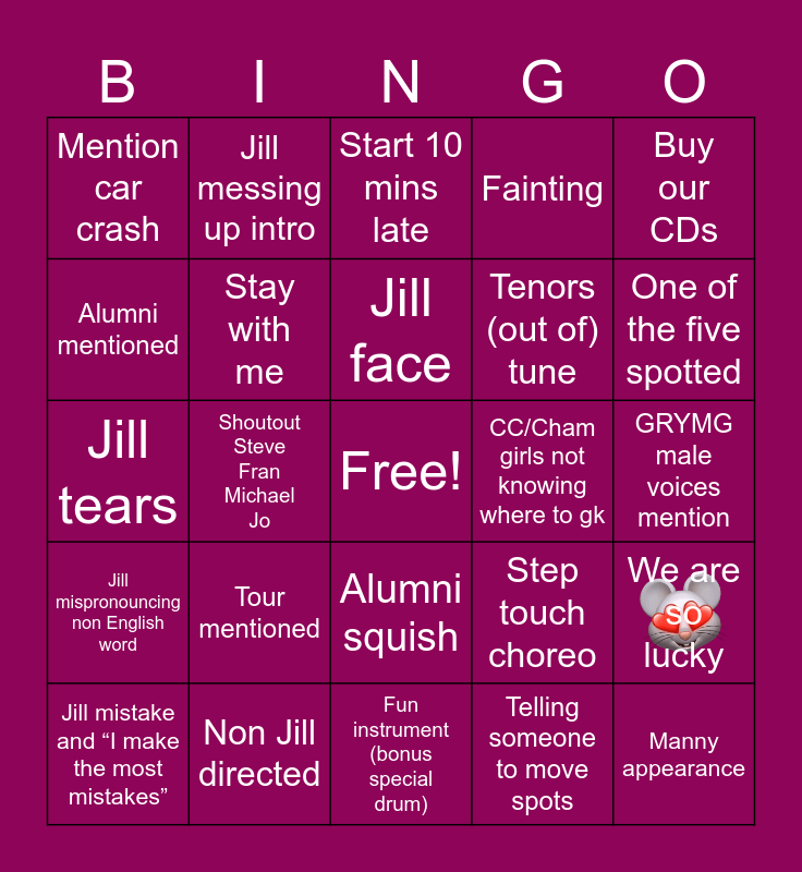 This bingo card has 1 images, a free space and 24 words: Tour mentioned, Non Jill directed, Jill face, Jill mistake and “I make the most mistakes”, Buy our CDs, Mention car crash, Alumni mentioned, Jill messing up intro, CC/Cham girls not knowing where to gk, Alumni squish, Tenors (out of) tune, Jill tears, Step touch choreo, We are so lucky, Stay with me, Telling someone to move spots, GRYMG male voices mention, Start 10 mins late, One of the five spotted, Shoutout Steve Fran Michael Jo, Manny appearance, Jill mispronouncing non English word, Fainting and Fun instrument (bonus special drum).
