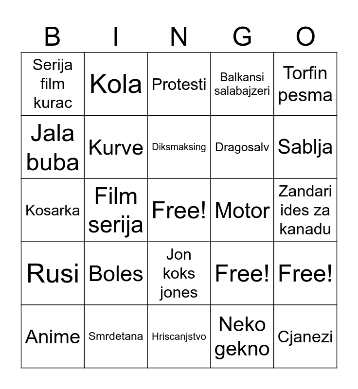 This bingo card has a free space and 24 words: Boles, Smrdetana, Diksmaksing, Anime, Torfin pesma, Serija film kurac, Jala buba, Kola, Motor, Jon koks jones, Dragosalv, Kosarka, Free!, Free!, Kurve, Neko gekno, Zandari ides za kanadu, Protesti, Sablja, Film serija, Cjanezi, Rusi, Balkansi salabajzeri and Hriscanjstvo.