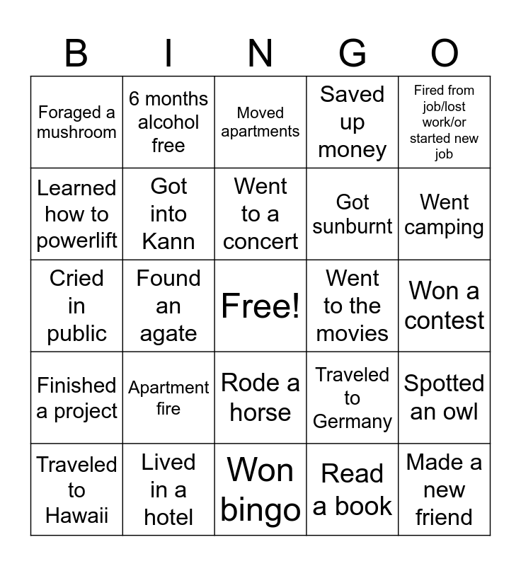 This bingo card has a free space and 24 words: Apartment fire, Lived in a hotel, Went to a concert, Traveled to Hawaii, Fired from job/lost work/or started new job, Foraged a mushroom, Learned how to powerlift, 6 months alcohol free, Went to the movies, Rode a horse, Got sunburnt, Cried in public, Traveled to Germany, Spotted an owl, Got into Kann, Read a book, Won a contest, Moved apartments, Went camping, Found an agate, Made a new friend, Finished a project, Saved up money and Won bingo.