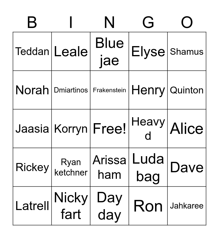 This bingo card has a free space and 24 words: Latrell, Ryan ketchner, Frakenstein, Ron, Shamus, Teddan, Leale, Blue jae, Heavy d, Alice, Jaasia, Dmiartinos, Luda bag, Dave, Norah, Nicky fart, Day day, Elyse, Quinton, Rickey, Korryn, Arissa ham, Henry and Jahkaree.