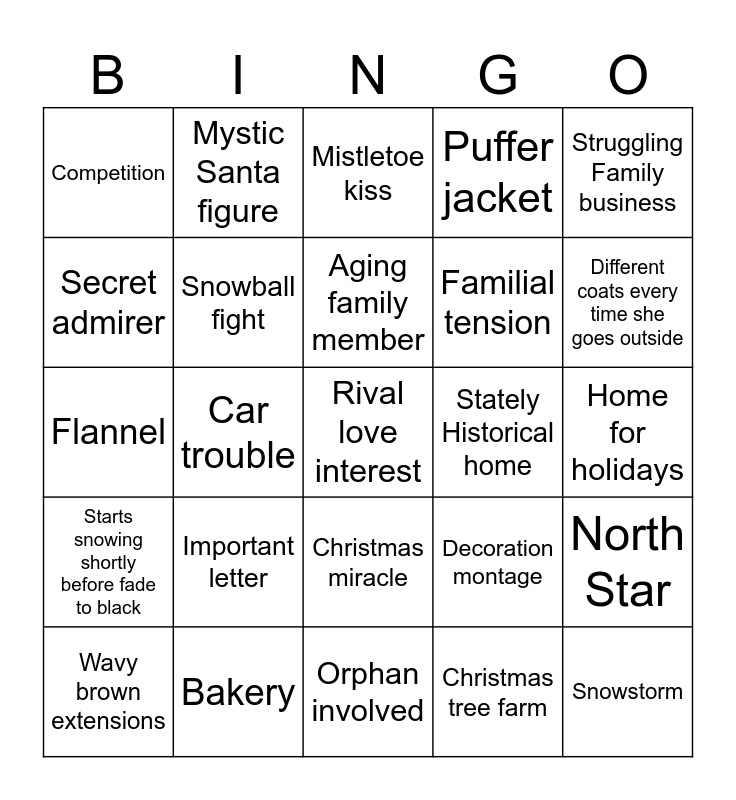 This bingo card has a free space and 34 words: Single parent (dead) especially father, Christmas tree farm, Royalty free Christmas music, “True meaning of Christmas”, Starts snowing shortly before fade to black, Snowball fight, Struggling Family business, Wavy brown extensions, Mystic Santa figure, Small town (job in big city), Aging family member, Mistletoe kiss, Big entrance in the formal gown, Someone is a Writer, Stately Historical home, Different coats every time she goes outside, Bakery, Flannel, Important letter, Decoration montage, Christmas miracle, Light lined street at night, Competition, Home for holidays, Orphan involved, Snowstorm, Puffer jacket, Partner accepted by family, Familial tension, Secret admirer, Horse, Car trouble, North Star and Idealisticly wrapped presents.