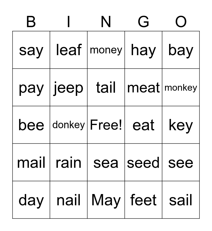 This bingo card has a free space and 24 words: rain, nail, tail, day, bay, say, pay, leaf, eat, sea, meat, bee, seed, see, jeep, feet, key, money, monkey, donkey, sail, mail, hay and May.