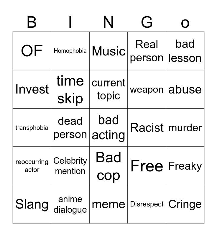 This bingo card has 25 words: Celebrity mention, meme, current topic, Slang, bad lesson, OF, Invest, Homophobia, Racist, Bad cop, weapon, transphobia, Free, Freaky, time skip, Cringe, murder, Music, abuse, dead person, bad acting, anime dialogue, reoccurring actor, Real person and Disrespect.