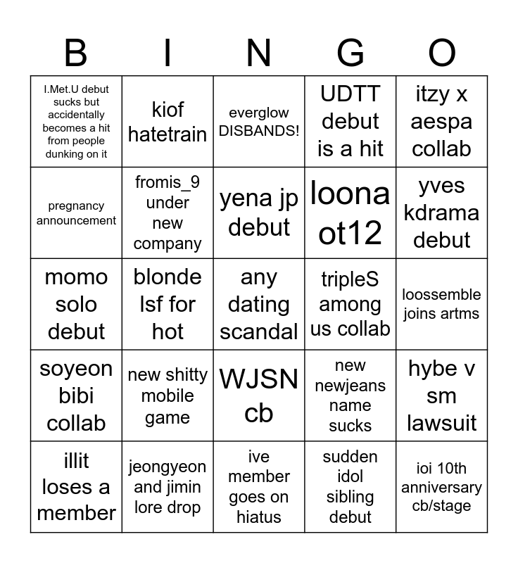 This bingo card has a free space and 24 words: new shitty mobile game, jeongyeon and jimin lore drop, yena jp debut, illit loses a member, itzy x aespa collab, I.Met.U debut sucks but accidentally becomes a hit from people dunking on it, pregnancy announcement, kiof hatetrain, tripleS among us collab, WJSN cb, loona ot12, momo solo debut, new newjeans name sucks, hybe v sm lawsuit, fromis_9 under new company, sudden idol sibling debut, loossemble joins artms, everglow DISBANDS!, yves kdrama debut, blonde lsf for hot, ioi 10th anniversary cb/stage, soyeon bibi collab, UDTT debut is a hit and ive member goes on hiatus.