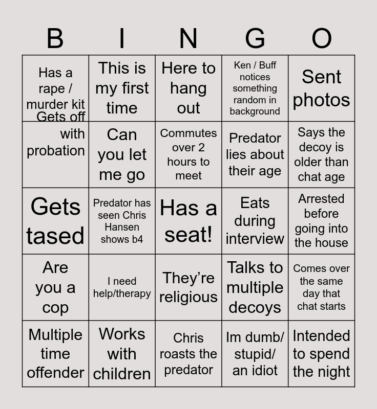 This bingo card has a free space and 34 words: Here for Conversation, Im dumb/ stupid/ an idiot, Married, Has kids, Are you a cop, Can you let me go, Sent photos, Multiple time offender, This is my first time, I wasn’t going to do anything, Commutes over 2 hours to meet, Here to hang out, I was concerned about her/him, Runs away, Eats during interview, Says the decoy is older than chat age, Works with children, Gets tased, I need help/therapy, Talks to multiple decoys, They’re religious, Tries to hug/kiss the decoy, Has a rape / murder kit, Arrested before going into the house, Chris roasts the predator, Intended to spend the night, Ken / Buff notices something random in background, Wants to talk off camera, Predator lies about their age, Gets off with probation, Serves time in jail, Predator has seen Chris Hansen shows b4, Comes over the same day that chat starts and I wouldn’t have done anything.
