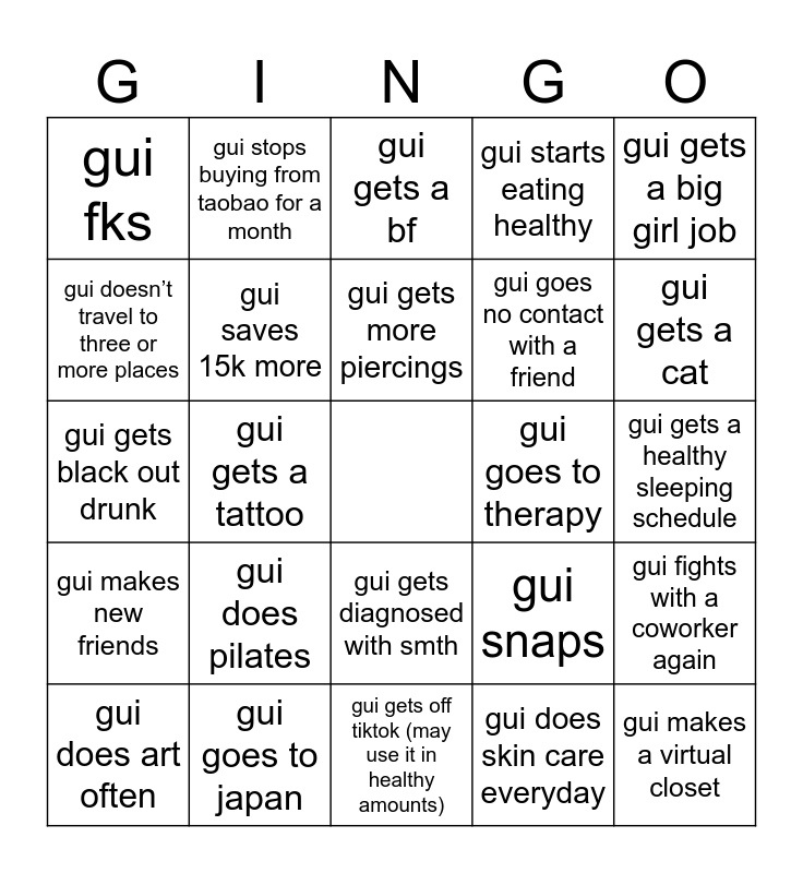 This bingo card has a free space and 24 words: gui does pilates, gui goes to japan, gui gets more piercings, gui does art often, gui gets a big girl job, gui fks, gui doesn’t travel to three or more places, gui stops buying from taobao for a month, gui goes to therapy, gui gets diagnosed with smth, gui goes no contact with a friend, gui gets black out drunk, gui snaps, gui fights with a coworker again, gui saves 15k more, gui does skin care everyday, gui gets a healthy sleeping schedule, gui gets a bf, gui gets a cat, gui gets a tattoo, gui makes a virtual closet, gui makes new friends, gui starts eating healthy and gui gets off tiktok (may use it in healthy amounts).