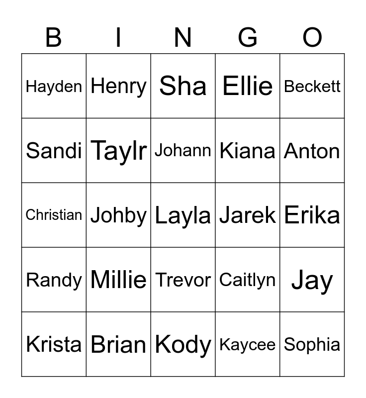 This bingo card has 54 words: Free!, Randy, Jana, Sadie, Trevor, Will, Ellie, Landon, Sandi, Rick, Hayden, Josh, Brian, Krista, Kaden, Kody, Layla, Kiana, Steve, Erika, Caitlyn, Jessie, Jarek, Beckett, Gideon, Henry, Nate, Kayli, Jadon, Kaycee, James M, Tyler, Emily, Kevin, Sha, Teagan, Christian, Jay, Sophia, Taylr, Stewart, James, Madeline, Kylan, Millie, Grandma, Grandpa, Kim, Johann, Johby, Anton, Andre, Anya and Jakob.