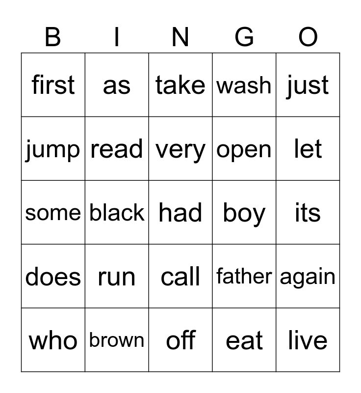 This bingo card has a free space and 24 words: run, brown, very, who, just, first, jump, as, boy, call, open, some, father, again, read, eat, its, take, let, black, live, does, wash and off.