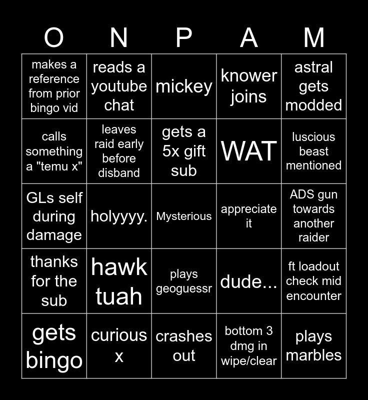 This bingo card has a free space and 27 words: dude..., hi aiiy, WAT, crashes out, calls something a "temu x", mickey, reads a youtube chat, thanks for the sub, appreciate it, ft loadout check mid encounter, GLs self during damage, knower joins, gets bingo, curious x, luscious beast mentioned, checks someones report, leaves raid early before disband, gets a 5x gift sub, hawk tuah, makes a reference from prior bingo vid, ADS gun towards another raider, bottom 3 dmg in wipe/clear, holyyyy., plays marbles, plays geoguessr, astral gets modded and raided by stream with 100+ viewers.