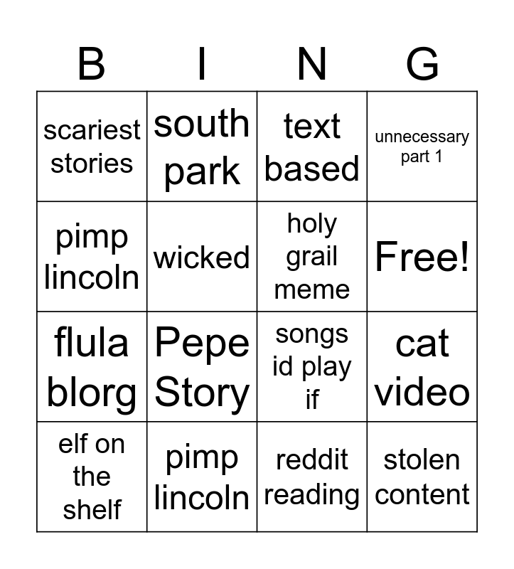 This bingo card has 18 words: Pepe Story, stolen content, text based, scariest stories, songs id play if, unnecessary part 1, elf on the shelf, south park, Free!, flula blorg, reddit reading, pimp lincoln, cat video, wicked, holy grail meme, jjk, pimp lincoln and Reddit Reading.