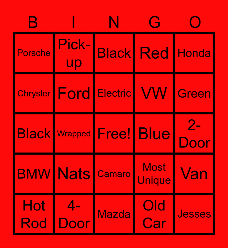 This bingo card has a free space and 24 words: Nats, 4-Door, Electric, Hot Rod, Honda, Porsche, Chrysler, Pick-up, Blue, Camaro, VW, Black, Most Unique, Van, Ford, Old Car, 2-Door, Black, Green, Wrapped, Jesses, BMW, Red and Mazda.