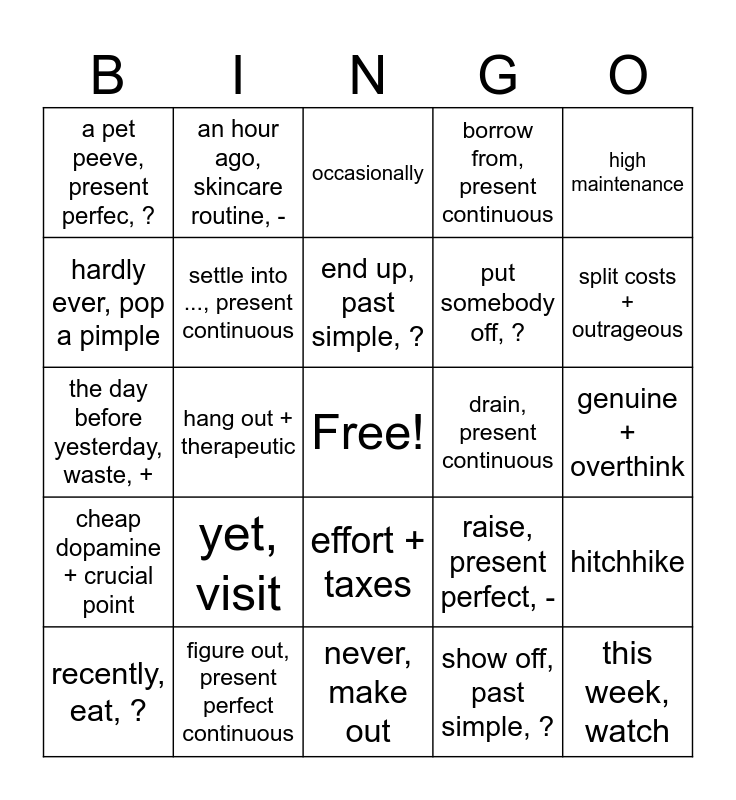This bingo card has a free space and 24 words: yet, visit, figure out, present perfect continuous, end up, past simple, ?, recently, eat, ?, high maintenance, a pet peeve, present perfec, ?, hardly ever, pop a pimple, an hour ago, skincare routine, -, drain, present continuous, effort + taxes, put somebody off, ?, the day before yesterday, waste, +, raise, present perfect, -, hitchhike, settle into ..., present continuous, show off, past simple, ?, genuine + overthink, occasionally, split costs + outrageous, hang out + therapeutic, this week, watch, cheap dopamine + crucial point, borrow from, present continuous and never, make out.