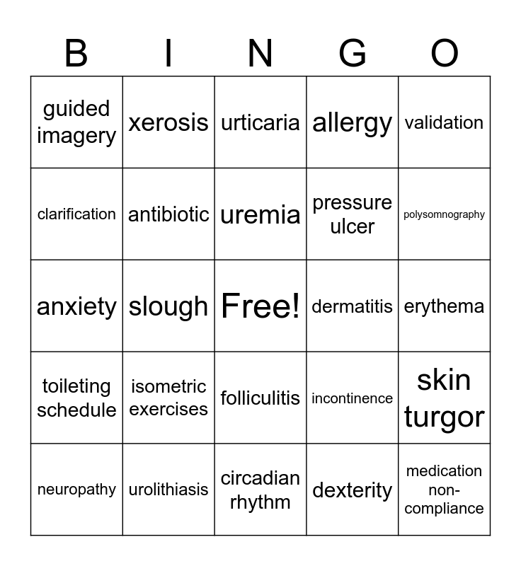 This bingo card has a free space and 24 words: isometric exercises, urolithiasis, uremia, neuropathy, validation, guided imagery, clarification, xerosis, dermatitis, folliculitis, pressure ulcer, anxiety, incontinence, skin turgor, antibiotic, dexterity, erythema, urticaria, polysomnography, slough, medication non-compliance, toileting schedule, allergy and circadian rhythm.