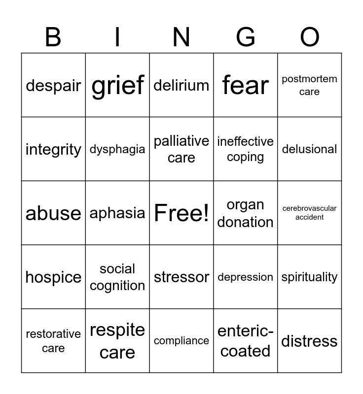 This bingo card has a free space and 24 words: social cognition, respite care, palliative care, restorative care, postmortem care, despair, integrity, grief, organ donation, stressor, ineffective coping, abuse, depression, spirituality, dysphagia, enteric-coated, cerebrovascular accident, delirium, delusional, aphasia, distress, hospice, fear and compliance.