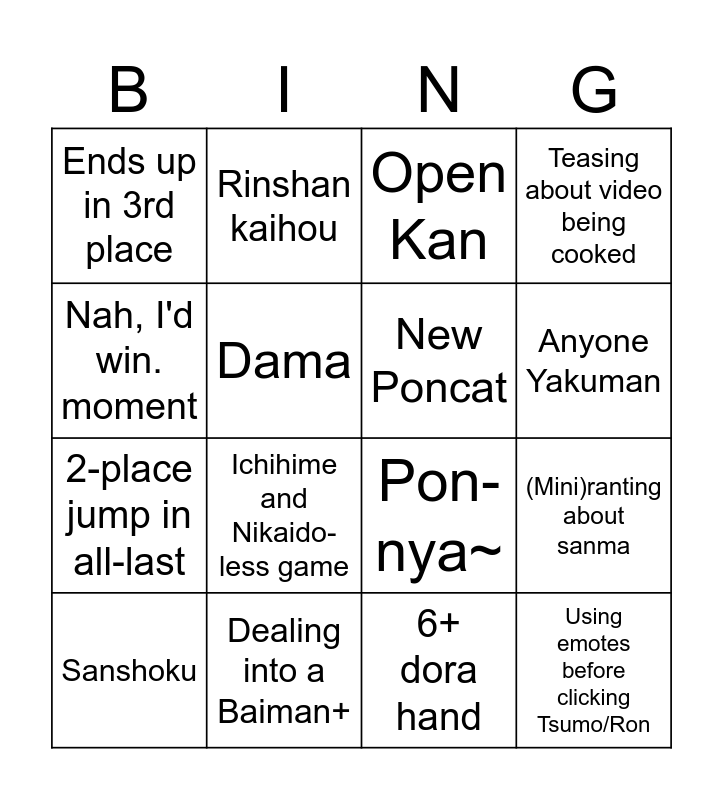 This bingo card has 16 words: Dealing into a Baiman+, (Mini)ranting about sanma, Open Kan, Ends up in 3rd place, 2-place jump in all-last, Rinshan kaihou, Pon-nya~, 6+ dora hand, Nah, I'd win. moment, Dama, Sanshoku, Teasing about video being cooked, Ichihime and Nikaido-less game, Anyone Yakuman, New Poncat and Using emotes before clicking Tsumo/Ron.