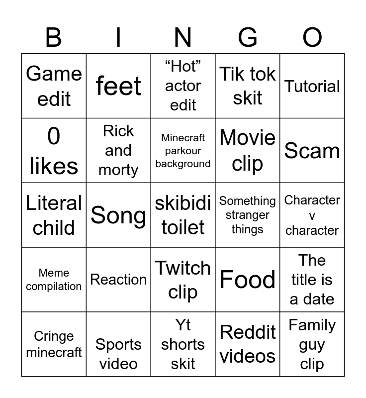 This bingo card has a free space and 24 words: Reaction, Sports video, Minecraft parkour background, Cringe minecraft, Tutorial, Game edit, 0 likes, feet, Something stranger things, Twitch clip, Movie clip, Literal child, Food, The title is a date, Rick and morty, Reddit videos, Character v character, “Hot” actor edit, Scam, Song, Family guy clip, Meme compilation, Tik tok skit and Yt shorts skit.