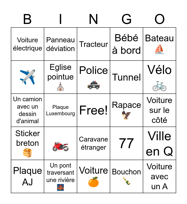 This bingo card has a free space and 28 words: Vache noire 🐄, Un pont traversant une rivière 🌉, Police 🚓, Bouchon 🍾, Bateau ⛵, Voiture électrique, Eglise pointue ⛪, Voiture 🍊, Rapace 🦅, Ville en Q, Un camion avec un dessin d'animal, Plaque Luxembourg, 77, Voiture avec un A, ✈️, 🐶, Caravane étranger, Bébé à bord, Vélo 🚲, Plaque AJ, Panneau déviation, Décapotable, Tunnel, Voiture sur le côté, Sticker breton 🥞, 🏍️, Tracteur and Remorque.