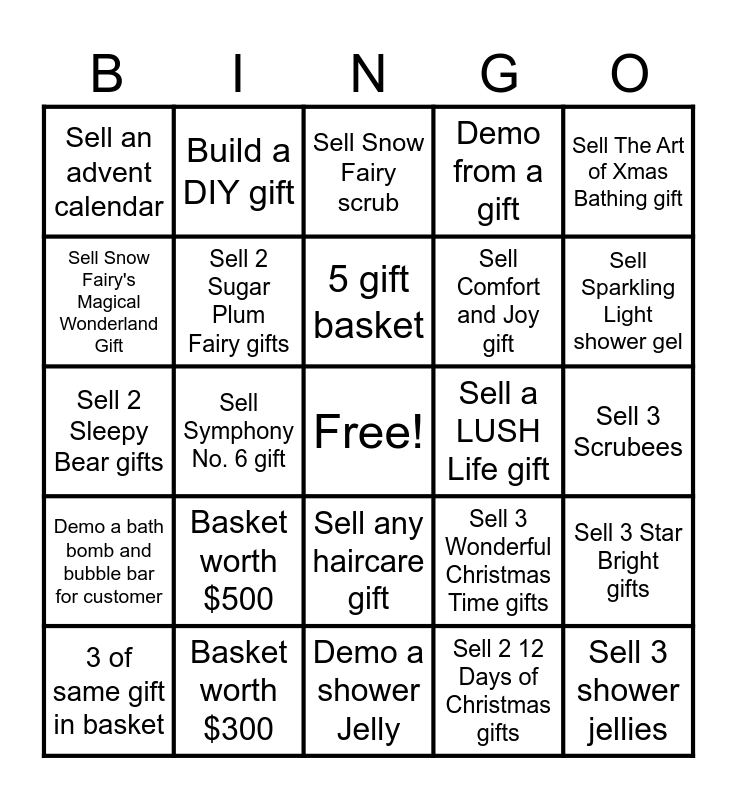 This bingo card has a free space and 24 words: Basket worth $500, Basket worth $300, 5 gift basket, 3 of same gift in basket, Sell The Art of Xmas Bathing gift, Sell an advent calendar, Sell Snow Fairy's Magical Wonderland Gift, Build a DIY gift, Sell a LUSH Life gift, Sell any haircare gift, Sell Comfort and Joy gift, Sell 2 Sleepy Bear gifts, Sell 3 Wonderful Christmas Time gifts, Sell 3 Star Bright gifts, Sell 2 Sugar Plum Fairy gifts, Sell 2 12 Days of Christmas gifts, Sell 3 Scrubees, Sell Snow Fairy scrub, Sell Sparkling Light shower gel, Sell Symphony No. 6 gift, Sell 3 shower jellies, Demo a bath bomb and bubble bar for customer, Demo from a gift and Demo a shower Jelly.