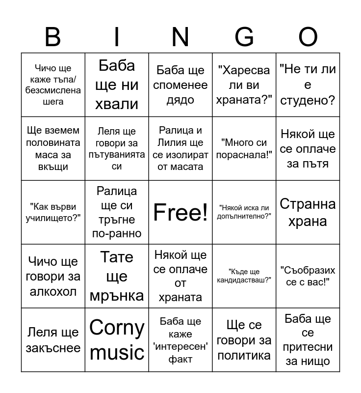 This bingo card has a free space and 29 words: Леля ще закъснее, Баба ще се разреве, Ралица ще си тръгне по-ранно, Гаден въпрос на викторината, Чичо ще каже тъпа/безсмислена шега, Баба ще споменее дядо, Леля ще говори за пътуванията си, Тате ще мрънка, "Някой иска ли допълнително?", Corny music, Странна храна, Баба ще се притесни за нищо, Баба ще каже 'интересен' факт, Ще се говори за политика, Някой ще се оплаче за пътя, "С какво ще се занимаваш?", Някой ще се оплаче от храната, Чичо ще говори за алкохол, "Не ти ли е студено?, "Как върви училището?", "Къде ще кандидастваш?", Ще питат дали сме разменяли подаръци, "Много си пораснала!", Ще вземем половината маса за вкъщи, "Харесва ли ви храната?", Баба ще ни хвали, "Съобразих се с вас!", Ралица и Лилия ще се изолират от масата and Тате ще излезе да пуши.