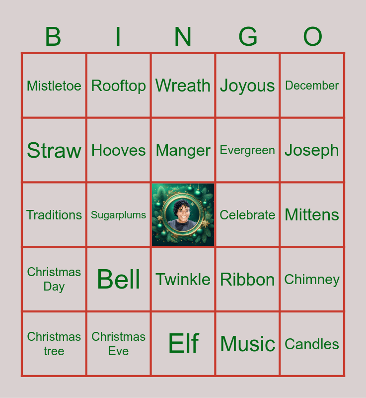 This bingo card has a free space and 76 words: Festive, Cranberries, Wreath, Jingle, Cheer, Sleigh, Bough, Reindeer, Fruitcake, Turkey, Icicles, Memories, Manger, Straw, Poinsettia, Sugarplums, Fireplace, Candles, Carolers, December, Greenery, Traditions, Hooves, Rooftop, Joyous, Bells, Tinsel, Garland, Mary, Nativity, Jesus, Holly, Sprinkles, Ribbon, Joseph, Evergreen, Snow, Myrrh, Mittens, Music, Nutcracker, Ornaments, Cookies, Season, Star, Jolly, Christmas tree, Mistletoe, Goodwill, Presents, Greetings, Twinkle, Eggnog, Advent calendar, Angel, Appreciative, Baking, Family, Beautiful, Belief, Bell, Birth, Blessing, Box, Caring, Caroling, Celebrate, Ceremony, Chestnuts, Chilly, Chimney, Christmas Day, Christmas Eve, Church, Elf and Elves.