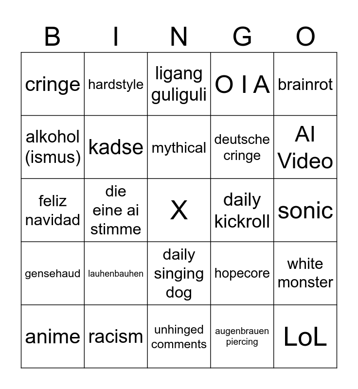 This bingo card has a free space and 24 words: lauhenbauhen, racism, mythical, anime, brainrot, cringe, alkohol (ismus), hardstyle, daily kickroll, daily singing dog, deutsche cringe, feliz navidad, hopecore, white monster, kadse, augenbrauen piercing, sonic, ligang guliguli, AI Video, die eine ai stimme, LoL, gensehaud, O I A and unhinged comments.