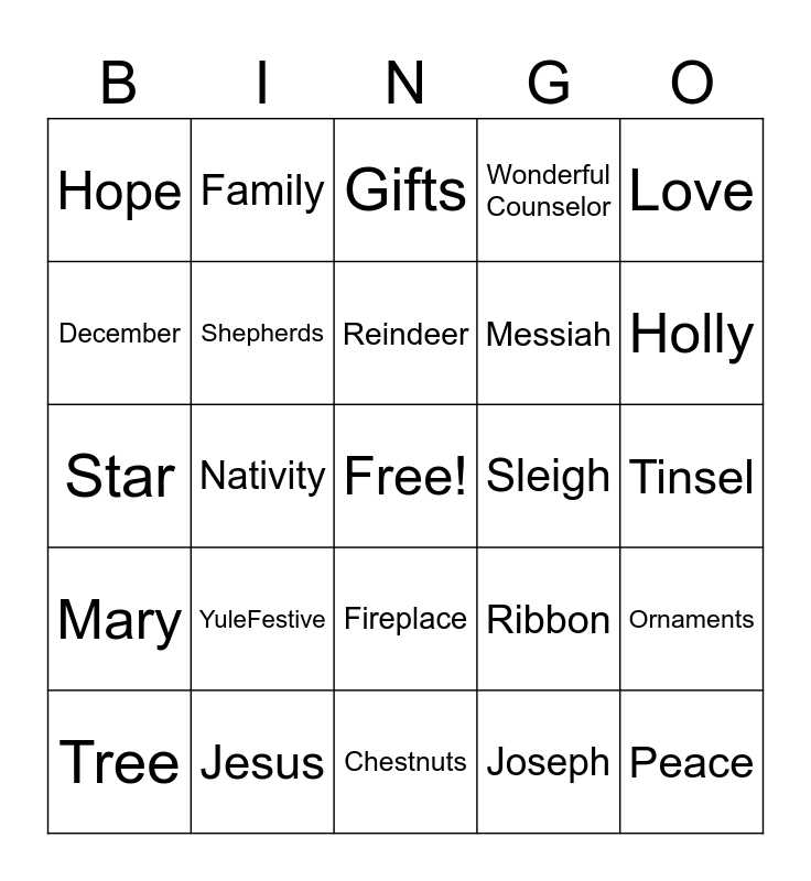 This bingo card has a free space and 58 words: Christmas, Jesus, Manger, Mary, Joseph, Angel, Shepherds, Bethlehem, Messiah, Immanuel, Wonderful Counselor, Mighty God, Everlasting Father, Prince of Peace, Advent, Hope, Peace, Love, Joy, Reindeer, Sleigh, Gifts, Tree, Ornaments, Lights, Tinsel, Stockings, Mistletoe, Holly, Wreath, Snow, Bells, Wise Men, Caroling, Gingerbread, Eggnog, Candy canes, Nativity, Star, Noel, YuleFestive, Poinsettia, Ribbon, Garland, Icicles, Cranberries, Peppermint, Fireplace, Chestnuts, Pine, Chimney, Sledding, Nutcracker, Greetings, Family, Holiday, December and Celebration.